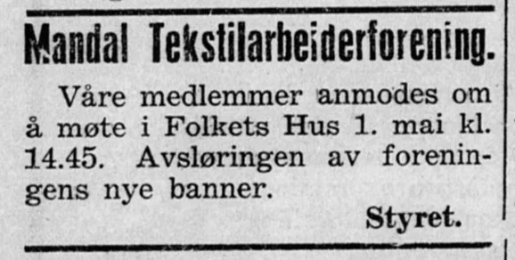 Denne annonsen hadde Mandal Tekstilarbeiderforening på trykk i avisen Sørlandet 29. april 1950. 1. mai 2025 er det 75 år siden foreningas nye banner, eller fane, var å se i byens 1. mai-tog!