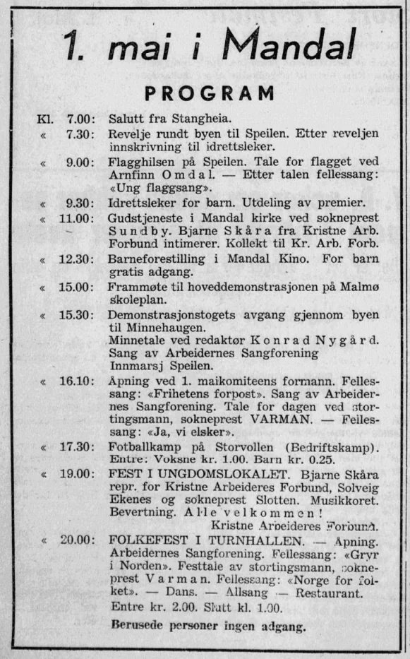 Mandal Tekstilarbeiderforenings nye fane ble altså avslørt for nøyaktig 75 år siden, 1. mai 1950. Avsløringa var i Folket hus, det som i dag eies av menigheten Maran Ata og ligger i Gismerøyaveien 5. Innholdet i det bygget har altså endra seg stort, men som annonsen over viser var det betydelige innslag av religiøst innhold i 1. mai-feiringa i 1950.