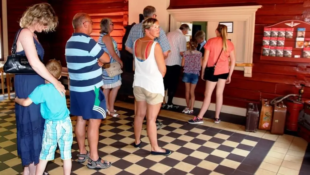 Populært å kjøre tog: Det har vært kø foran billettluka ved på Grovane i sommer. Foto: Anita Nilsen.