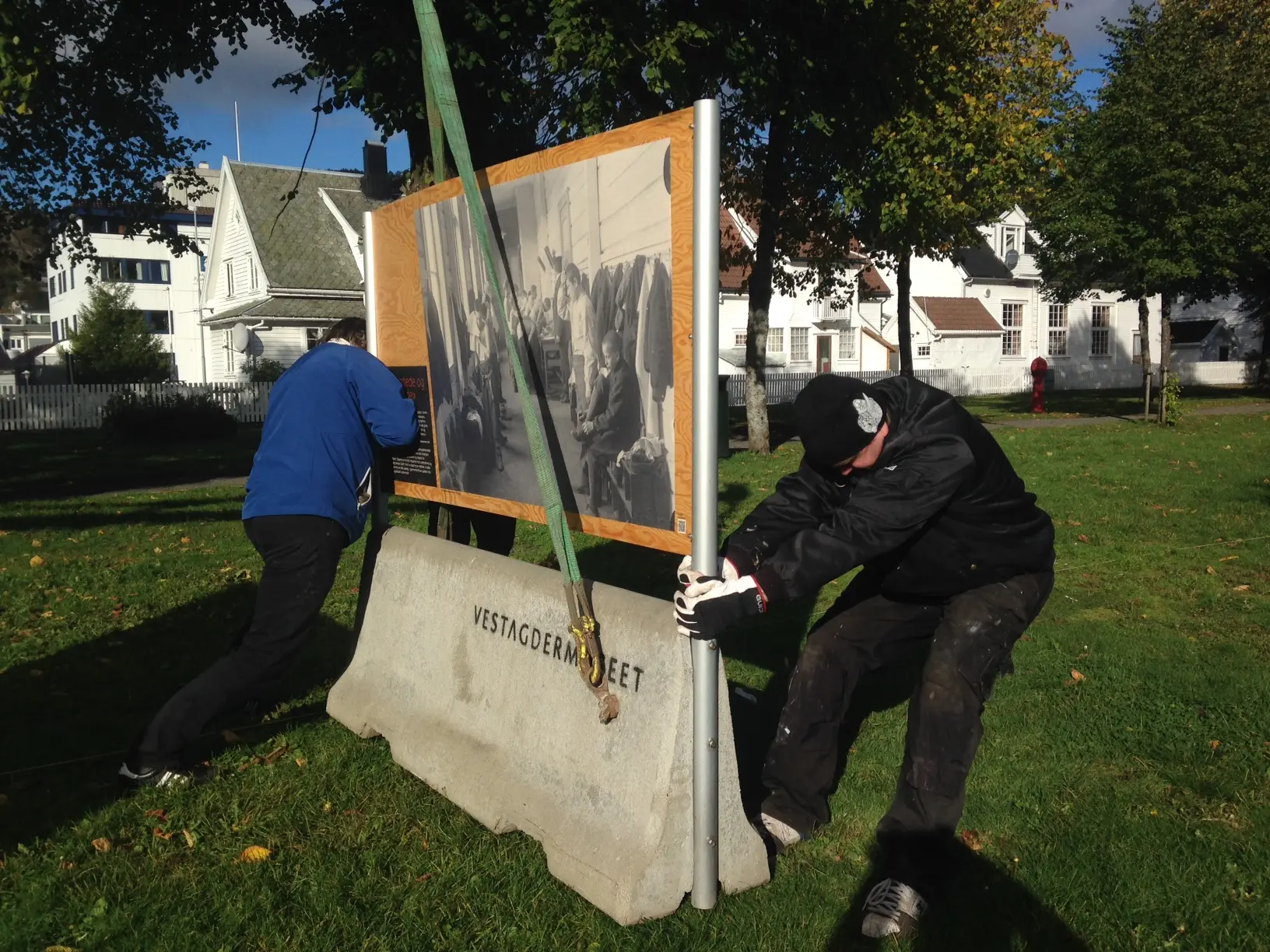 Brudd 2014 ankommer Sundeparken. De solide betongfenderne utstillinga er montert på manøvreres på plass. Foto: Gunhild Aaby.
