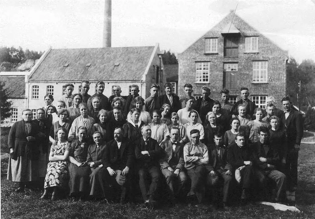 Ansatte ved Sjølingstad Uldvarefabrik i 1929. Flere unge gutter var ansatt på fabrikken allerede da, og mange av disse finner vi igjen blant de organiserte i 1935.