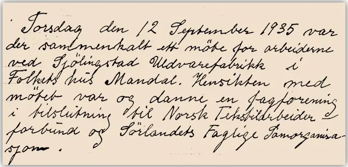 I nærmeste by, Mandal, organiserte sagbruksarbeidere (1914) og jern- og metallarbeidere seg tidlig (1919). Innefor tekstilbransjen varte det lenger. Norsk Tekstilarbeiderforening hadde blitt oppretta i 1924 og jobba hardt for å verve medlemmer i landets sørligste fylker.