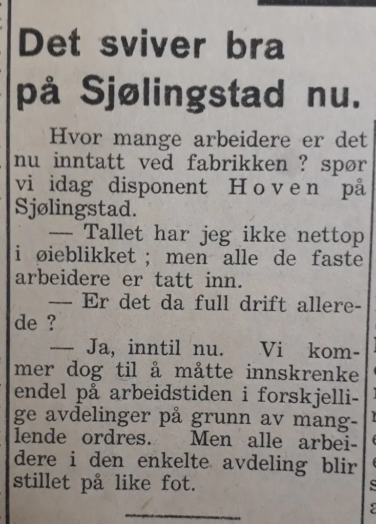 Allerede 13. mai skrev avisene at det gikk mot ei løsning på Sjølingstad Uldvarefabrik, og 27. mai skrev Lindesnes avis at «Det sviver bra på Sjølingstad», en fire måneder lang streik var over!