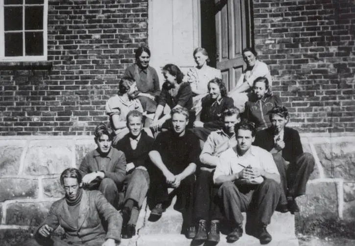 Et knippe arbeidere på trappa foran veveriet på 1930-tallet.