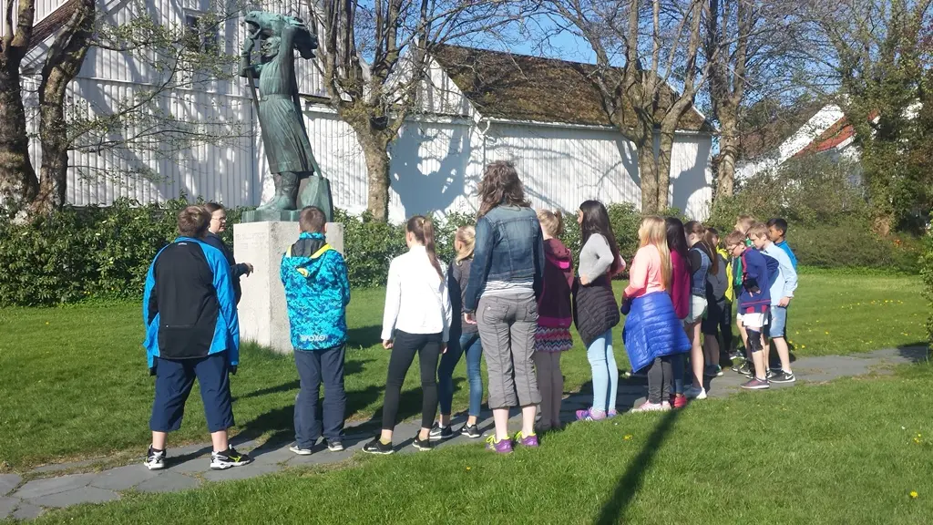 Elever fra Frøysland skole studerer Gustav Vigeland-statuen i Andorsenhagen