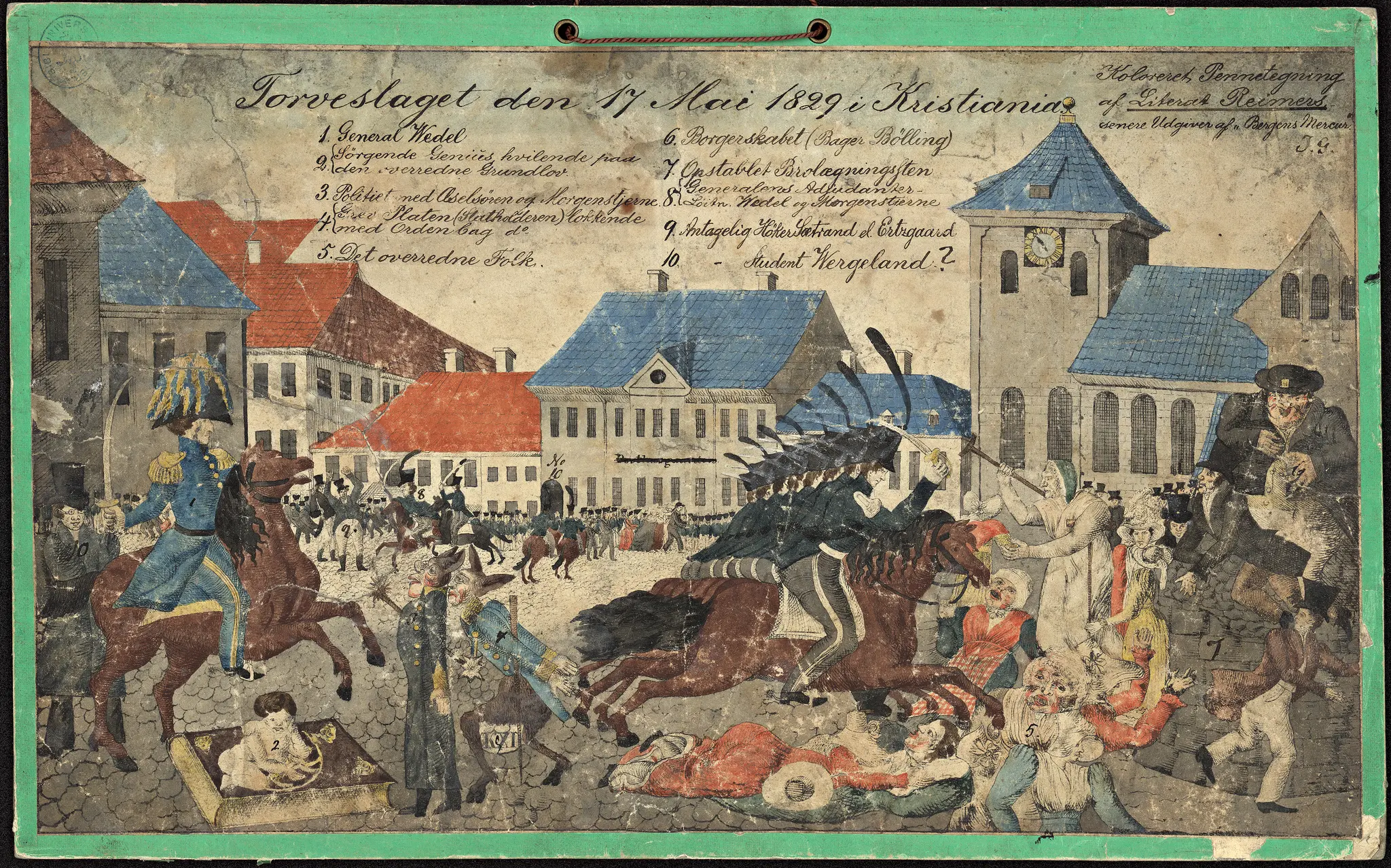 Torvslaget 1829. Foto: Koloreret Pennetegning af Literat Reimers / Nasjonalbiblioteket.