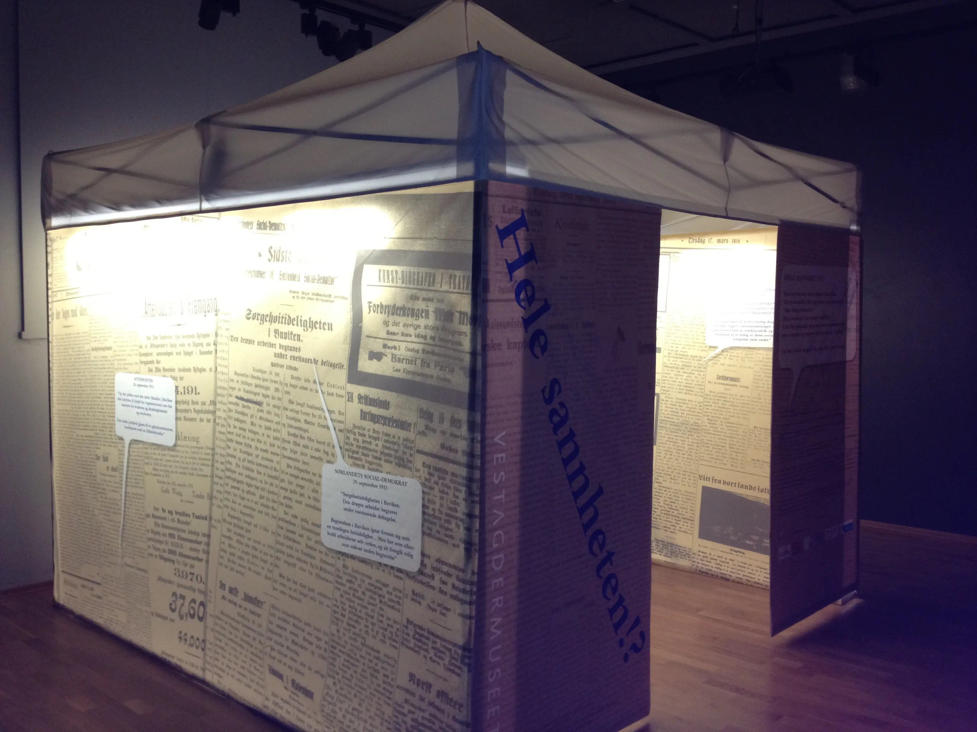 Det er bakgrunnen for den lille utstillinga «Hele sannheten!?» som ble stilt ut ved Kristiansand museum vinteren 2012/13. I et rom i rommet – et lysende telt – kunne publikum oppleve at museet møter seg selv i døra, med en 100 år gammel drapshistorie som bakteppe.
