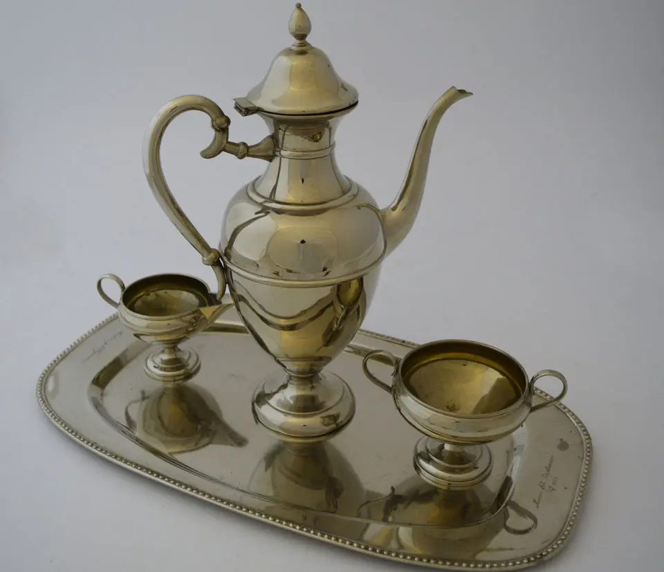 Kaffesett i sølvplett med inngravert tekst som viser takknemligheten til de reisende og togpersonalet som i tre dager fikk mat og husly hos familien Bjørndalen.