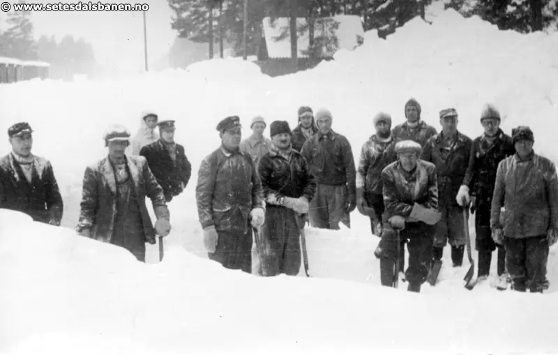 Snøryddere på Setesdalsbanen. Selv om bildet er fra 1952, ble sporet den gang som i mars 1924 ryddet med spader. Foto Setesdalsbanens arkiv.