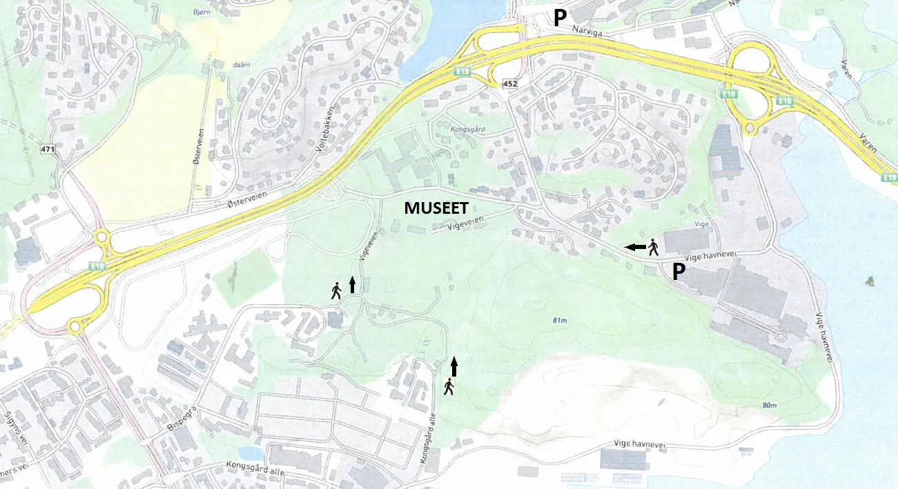 Parkeringsplassen ved museet blir fort full, men det er tillatt å parkere med Meny Albert (Olav Trygvasons vei 2) og ved Gustav Pedersen på Vige. Herfra kan du gå Vigeveien opp til museet. Det er også mulig å parkere på Lundsiden og gå til museet (ca 5 minutter) opp stien fordi kolonikagene. Man kan også parkere ved Bispegra og gå derfra. Vi oppfordrer alle til å la bilen stå og bruke buss. Bjørndalssletta er nærmeste stopp. Det er ikke lov å parkere i stikkveiene langs Vigeveien og det er heller ikke lov for museets besøkende å benytte seg av Kløvertuns parkeringer.