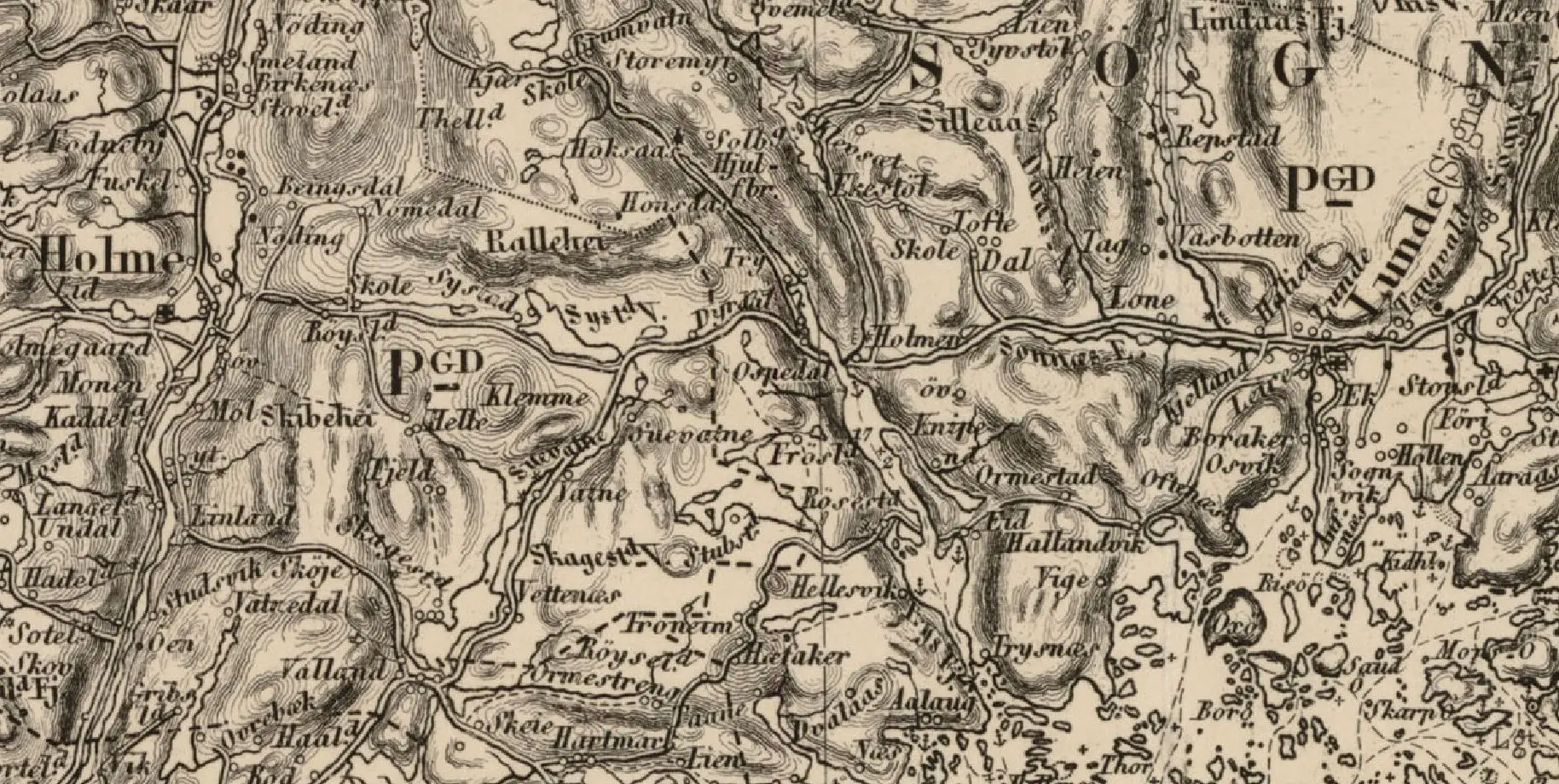 Denne ble bygget med hjelp av håndmakt, stubbebrytere og trillebår. Da bygget man veien på enkleste måte uten store masseforflyttinger. Resultatet var bratte bakker og ferje over Trysfjorden. Utviklingen fra hest til hest og kjerre begynte da man måtte transportere masser i gruvene på Kongsberg. Da bestemte myndighetene at de ville ha en kjerrevei fra Kristiania (Oslo) til Stavanger for hurtigere transport av tropper og post. Her ble igjen Trysfjorden problemet. En bratt bakke ned til Holmen – ferge over fjorden – og en bratt bakke opp Ospedalen for å finne retningen videre gjennom Dyredalen. Skysstasjonene på Lunde i Søgne, og på Vatne drev da mye av transporten på strekningen. En brevpakke brukte den gang ca. en uke herfra til Stavanger, og man syntes utviklingen var fantastisk.