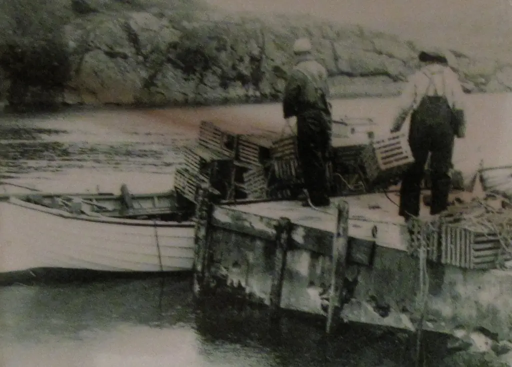 Åmodt og Johan Kristiansen fra Farestad på Skjernøya klar for hummerfiske omkring 1960. Teiner i tre brukes her. Bilde fra fiskeriutstillinga på Mandal museum.