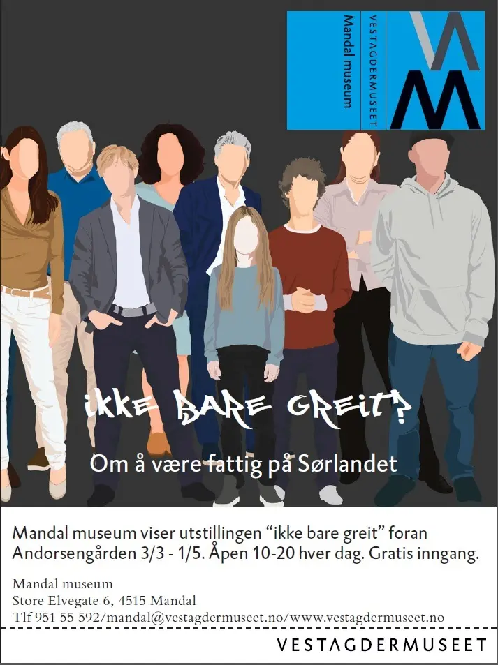 Utstillingen «Ikke bare greit? Om å være fattig på Sørlandet» vises i Andorsenhagen utenfor Mandal museum i perioden 3. mars – 1. mai, alle dager kl. 10-20.