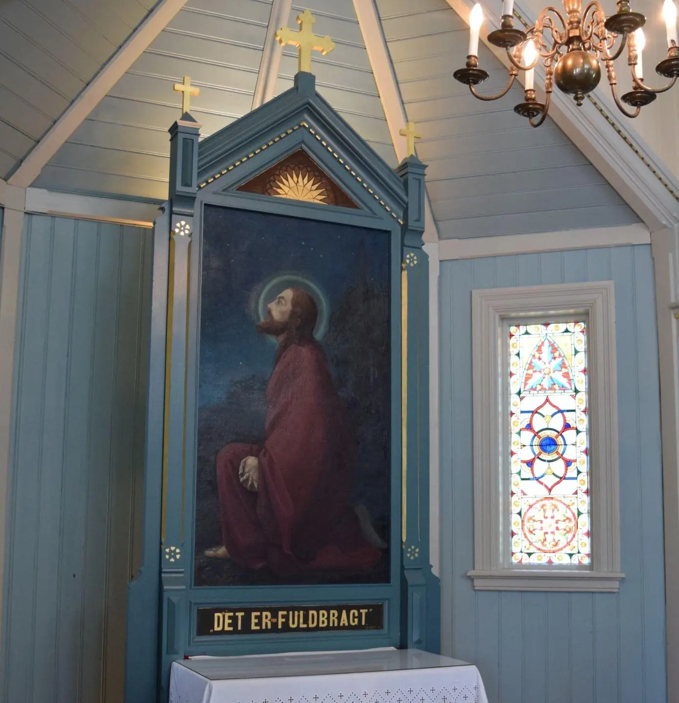 Maleriet montert tilbake i rammen i Justøy kapell. Foto: Vest-Agder-museet.