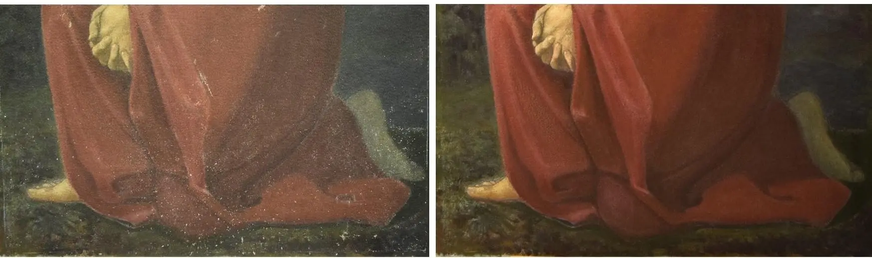 T.v.: Nederste del av motivet før behandling. T.h.: Nederste del av maleriet etter behandling.