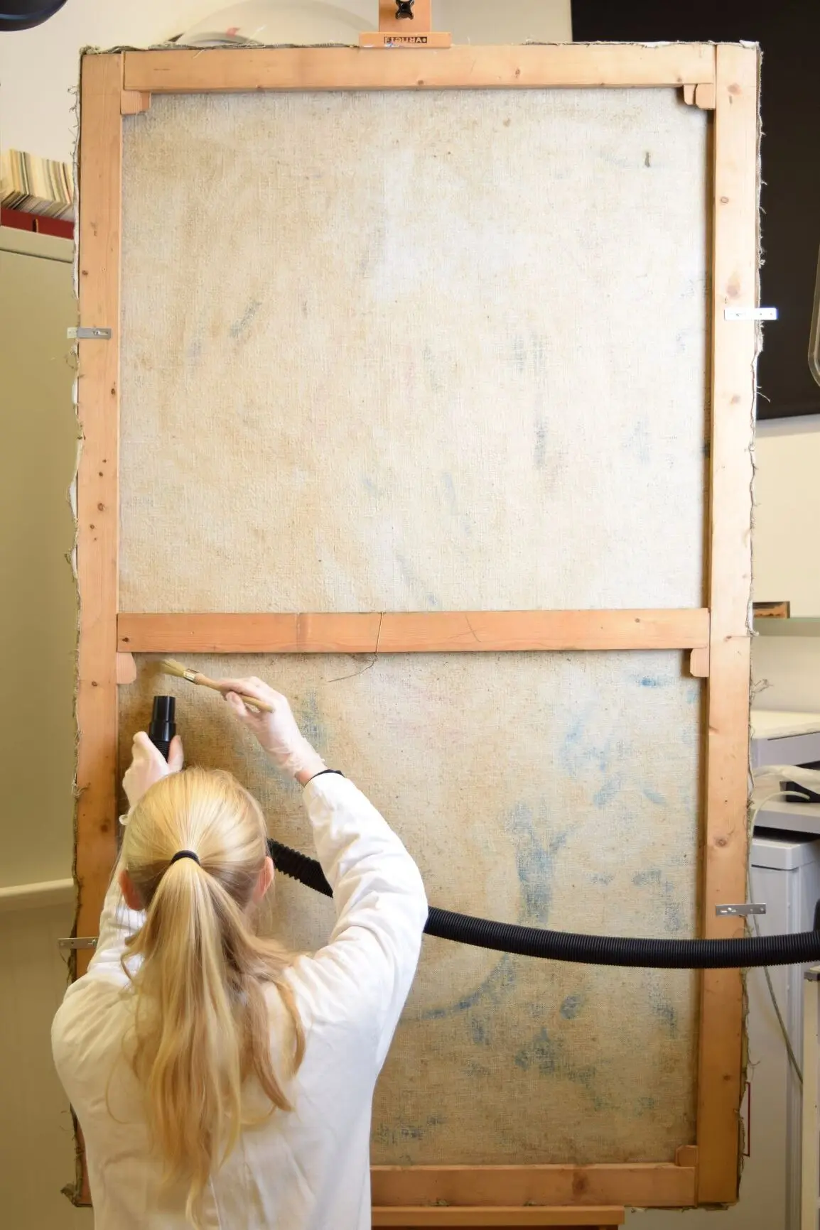 Malerikonservator Magnhild Aasen renser maleriets bakside. Foto: Vest-Agder-museet.