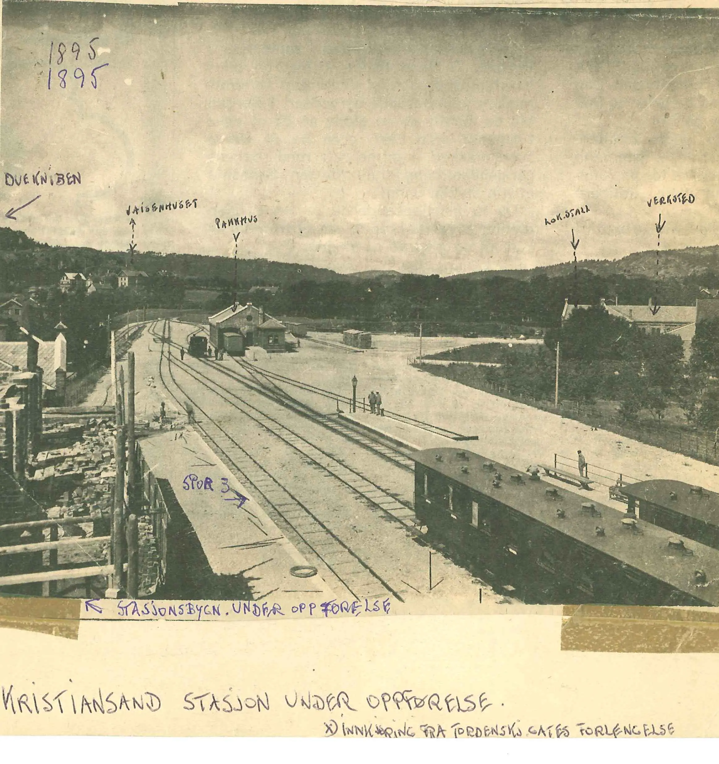 På bildet ser man til venstre stasjonsbygningen som var under oppførelse. Arkitekt var Paul Due (1835 – 1919) Til tross for at bygningen på bildet ser ganske uferdig ut, sto den klar til åpningen av Setesdalsbanen i 1896. Prislappen på Kristiansand stasjon ble kr 69.800.