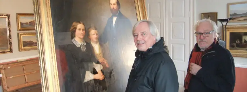 Adolph Tidemands familieportrett regnes som ett av hans hovedverker. Enhetsleder for allmennkultur Jon Røkland (t.v.) og konservator Svein A. Wiik studerer maleriet.