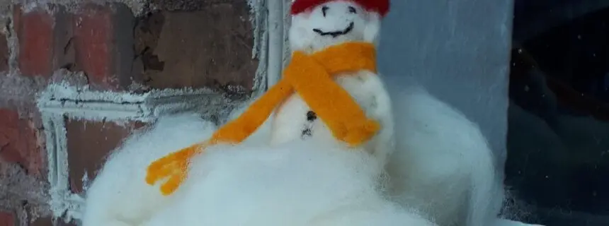 Hva med å lage en snømann i filt? Den er laget i hobbyfilt med filtnål og nål og tråd. Inni smømannen er det lagt litt ull, men du kan også bruke noen trådrester. Her er en pdf med forklaring på påskefigurer, snømannen er laget med samme metode: Filtfigur i hobbyfilt trinn for trinn