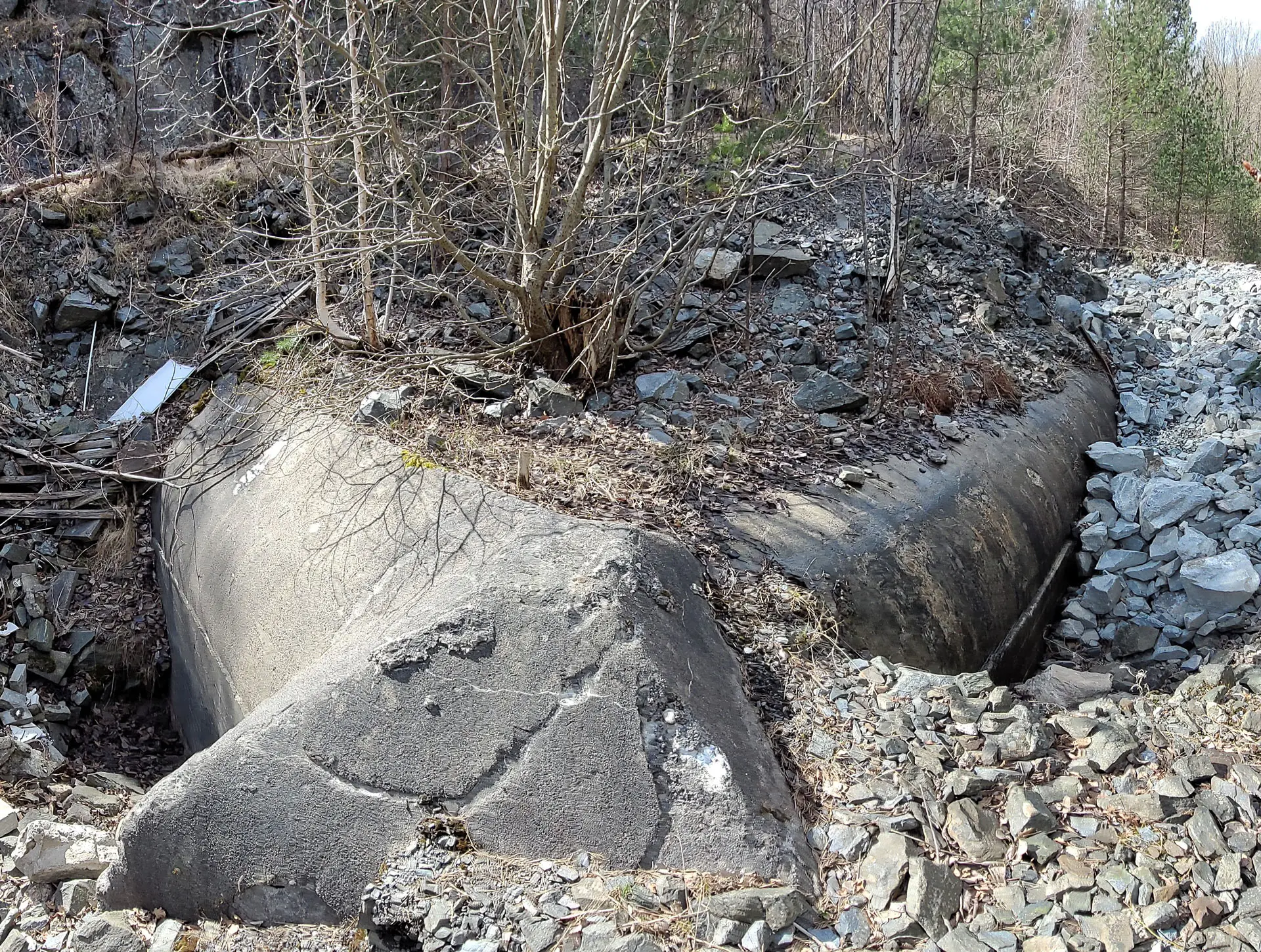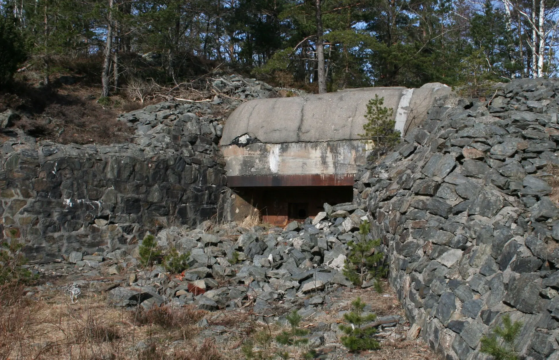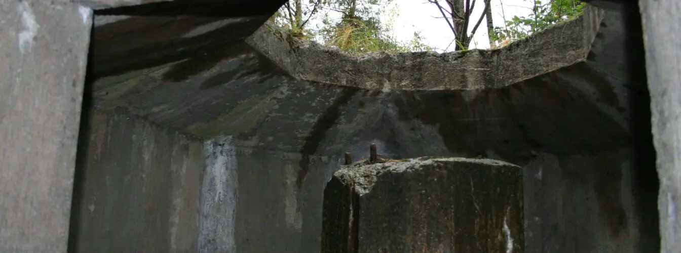 Fra landforsvarslinjen ved Møvik fort. På betongsokkelen var det en gang montert en bombekaster. Foto: Vest-Agder-museet.