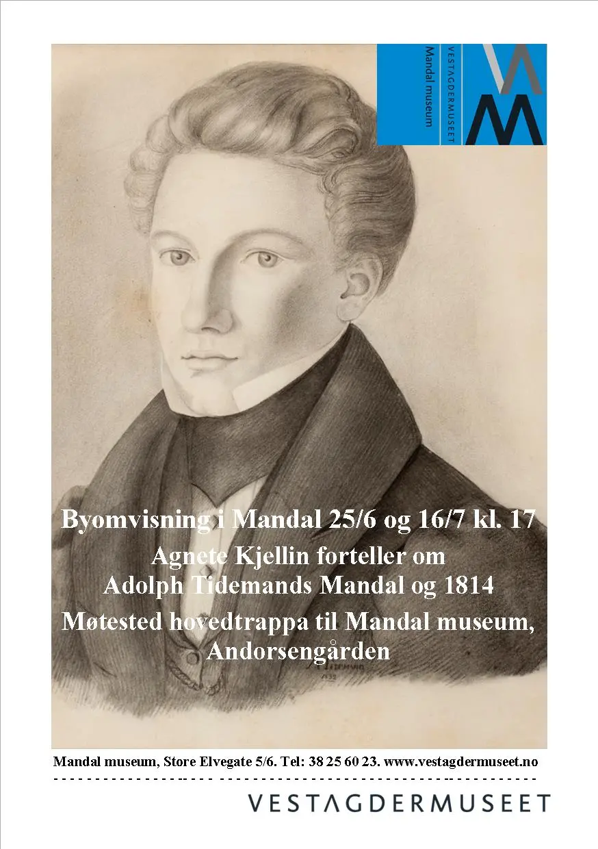 Onsdag 25. juni og 16. juli kl. 17 holder Agnete Kjellin byvandring med tema Adolph Tidemands Mandal og 1814. Begge vandringene starter ved hovedtrappa til Mandal museum.