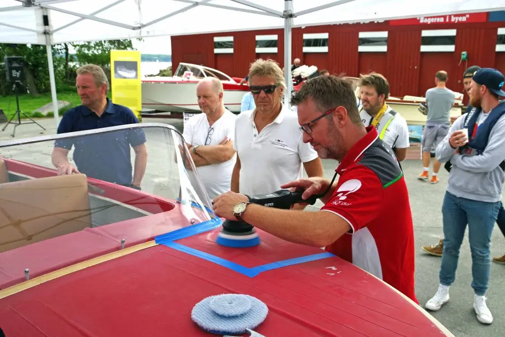 12:15: Gammel gelcoat kan bli som ny og Rune Sørensen (salgssjef i Holgers) demonstrerer hvordan den kan slipes og rubbes tilbake til opprinnelig farge og glans.