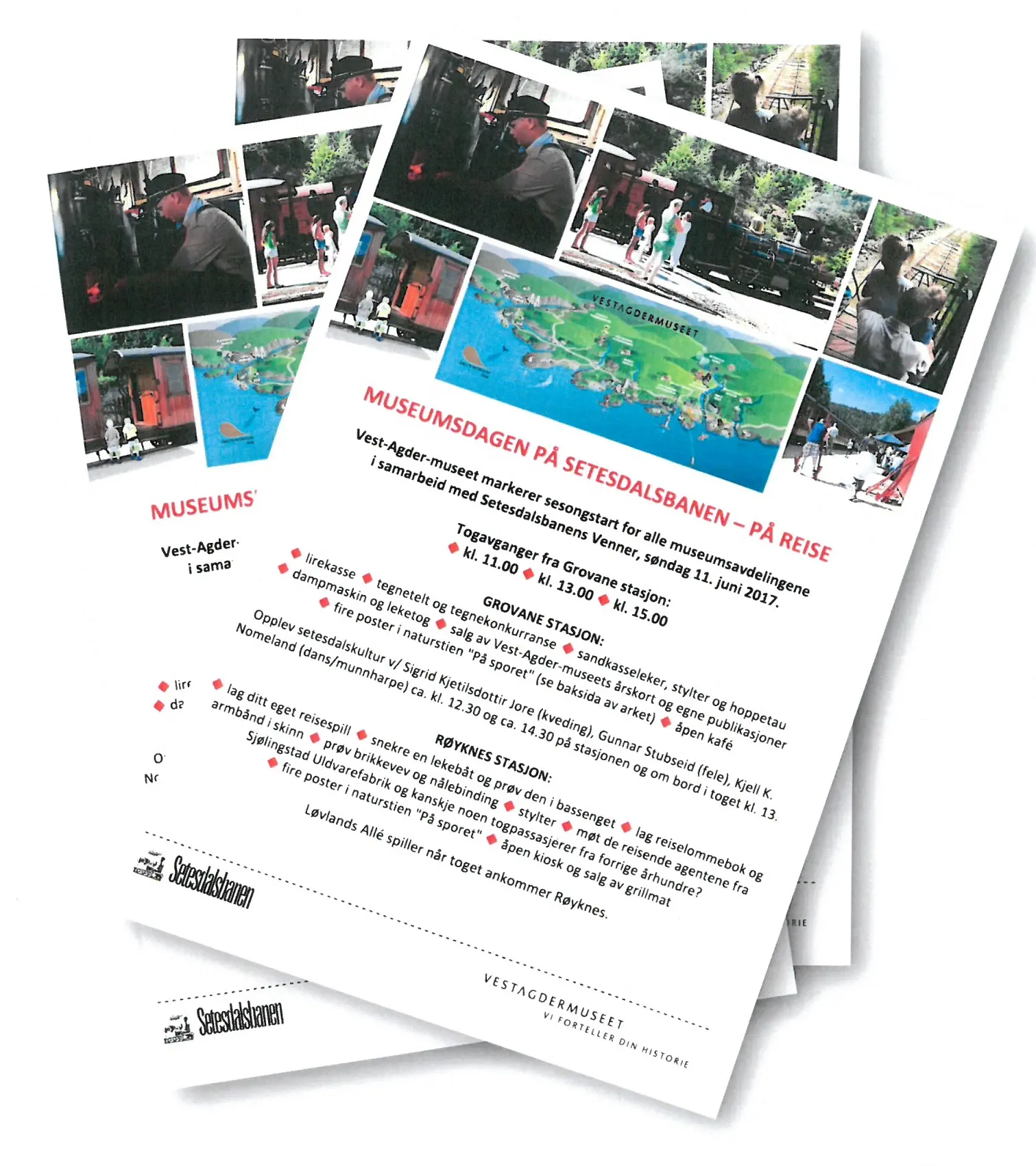 Vest-Agder-museets ulike museer er til stede med lirekasse og aktiviteter på Grovane og på Røyknes: tegnetelt og tegnekonkurranse, sporlek, barneleker, dampmaskin og ulike verkstedsaktiviteter. Du kan lage ditt eget reisespill, prøve brikkevev og lage bånd til reiseklærne, skinnpung til å putte reisepengene dine i og en båt av tre som lekefigurene dine kan reise i.