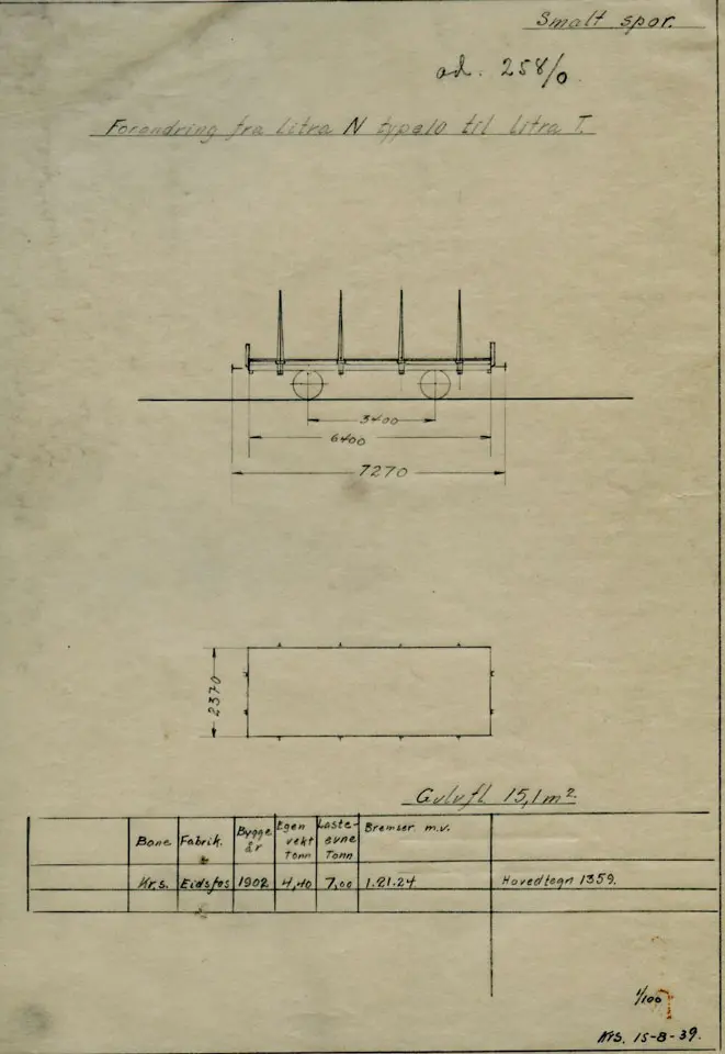 Teknisk tegning av smalsporet vogn (flatvogn). Tegningen ble laget i forbindelse med endring fra Litra N til Litra L. Vognen ble i sin tid bygget ved Eidsfos i 1902. Denne tegningen er fra 1939.