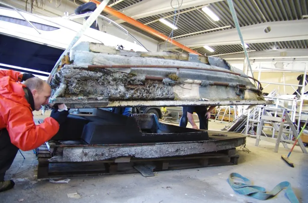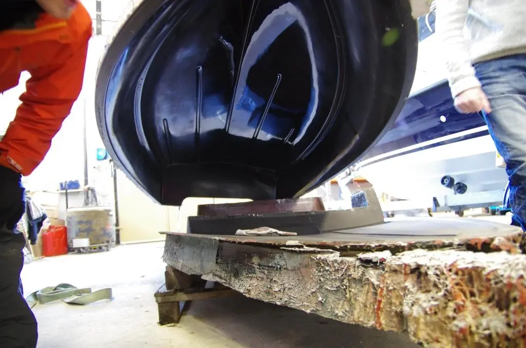 Da formene skulle hentes hadde de allerede blitt satt inn til tining i Skibsplasts lokaler. Skrog- og dekkformene var stablet oppå hverandre. Med god hjelp av Terje Hårtveit og Torgils Våge fikk vi løftet opp dekket for en liten inspeksjon.