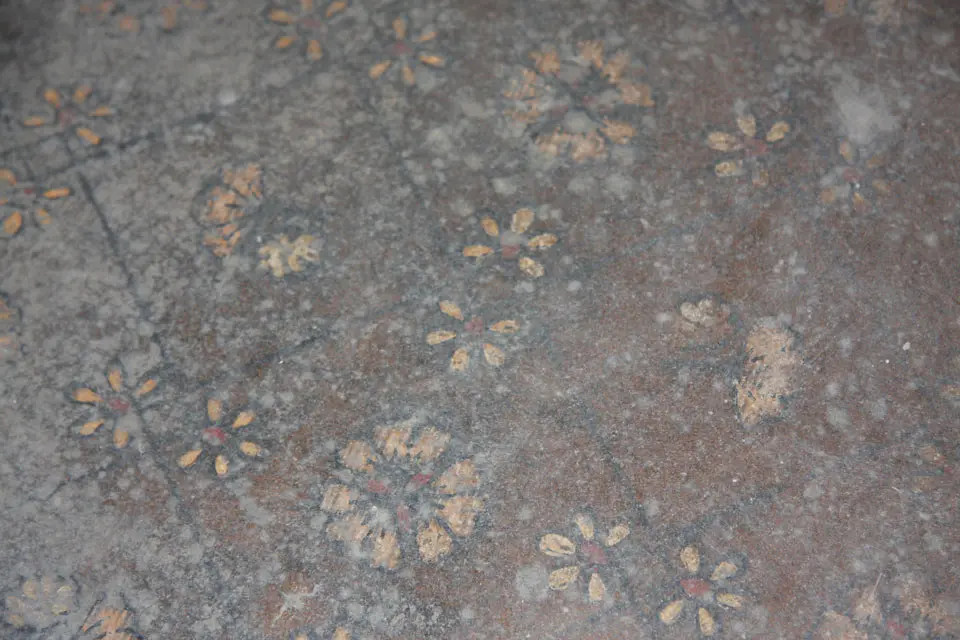 Da ansatte ved museets samlingsforvaltningsgruppe tok turen opp for å sette i gang med de første preventive tiltakene, var det mye sand og grus som lå på gulvene. God gammeldags rundvask med vann og såpe ville gjøre vondt verre for vognen. Arbeidet besto derfor av forsiktig kosting og støvsuging av gulvene. Under tykke lag med sand og grus, dukket plutselig konturene av et mønstret gulvbelegg opp. Ved å se på gamle foto fra samlingen til Norsk jernbanemuseum, kunne vi anta at gulvbelegget faktisk er det opprinnelige fra da vognen var ny. Fargene er naturlig nok svært falmede, men man skal ikke se bort ifra at ved nærmere undersøkelser, kan man avdekke felt hvor de opprinnelige fargene er synlige.