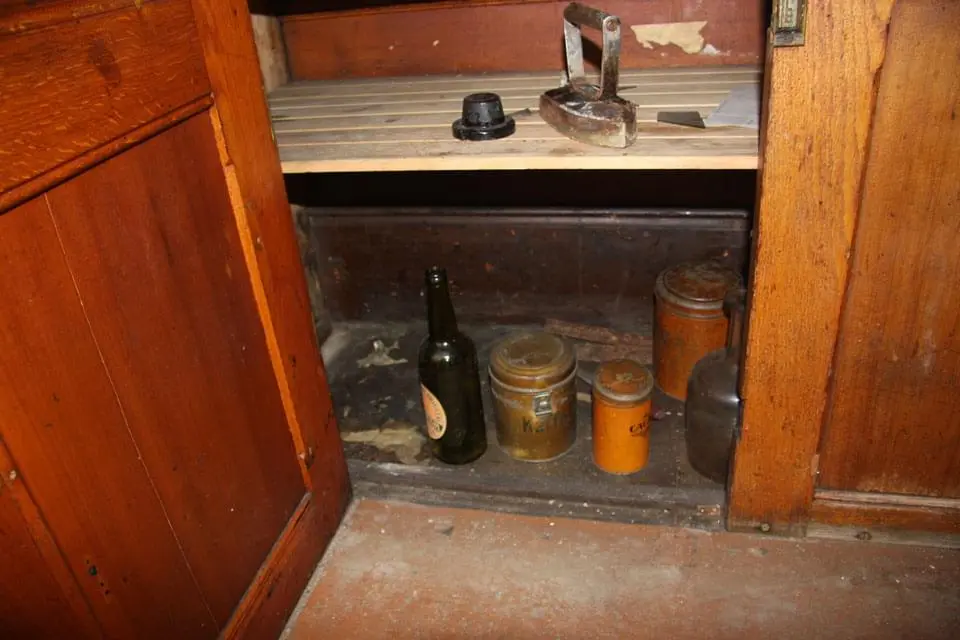 Den midtre delen av vognen ble ombygd til kjøkken da vognen ble tatt i bruk som hytte. Innholdet i skapene er nok fra denne tiden. Foto Thorunn Lunde.