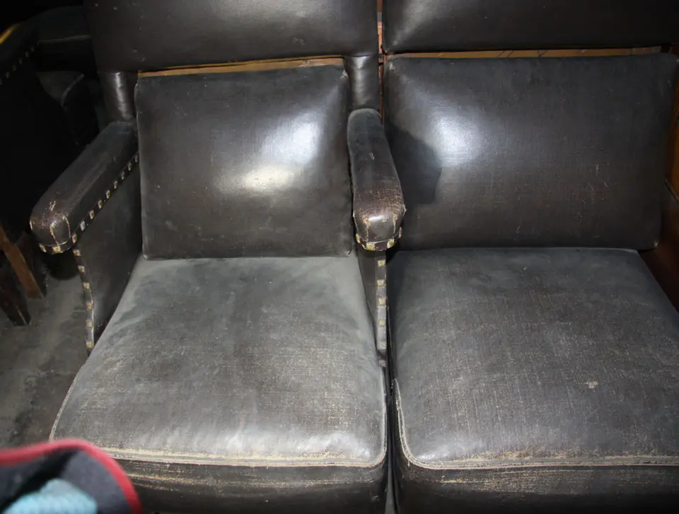 Seter trukket med pegamoid / kunstlær. Disse kan også gjøres om til soveplasser. Bildet viser før forsiktig tørking med tørr microfiberklut (setet til venstre) og etter (setet til høyre). Foto Thorunn Lunde