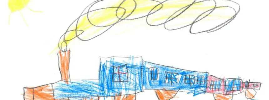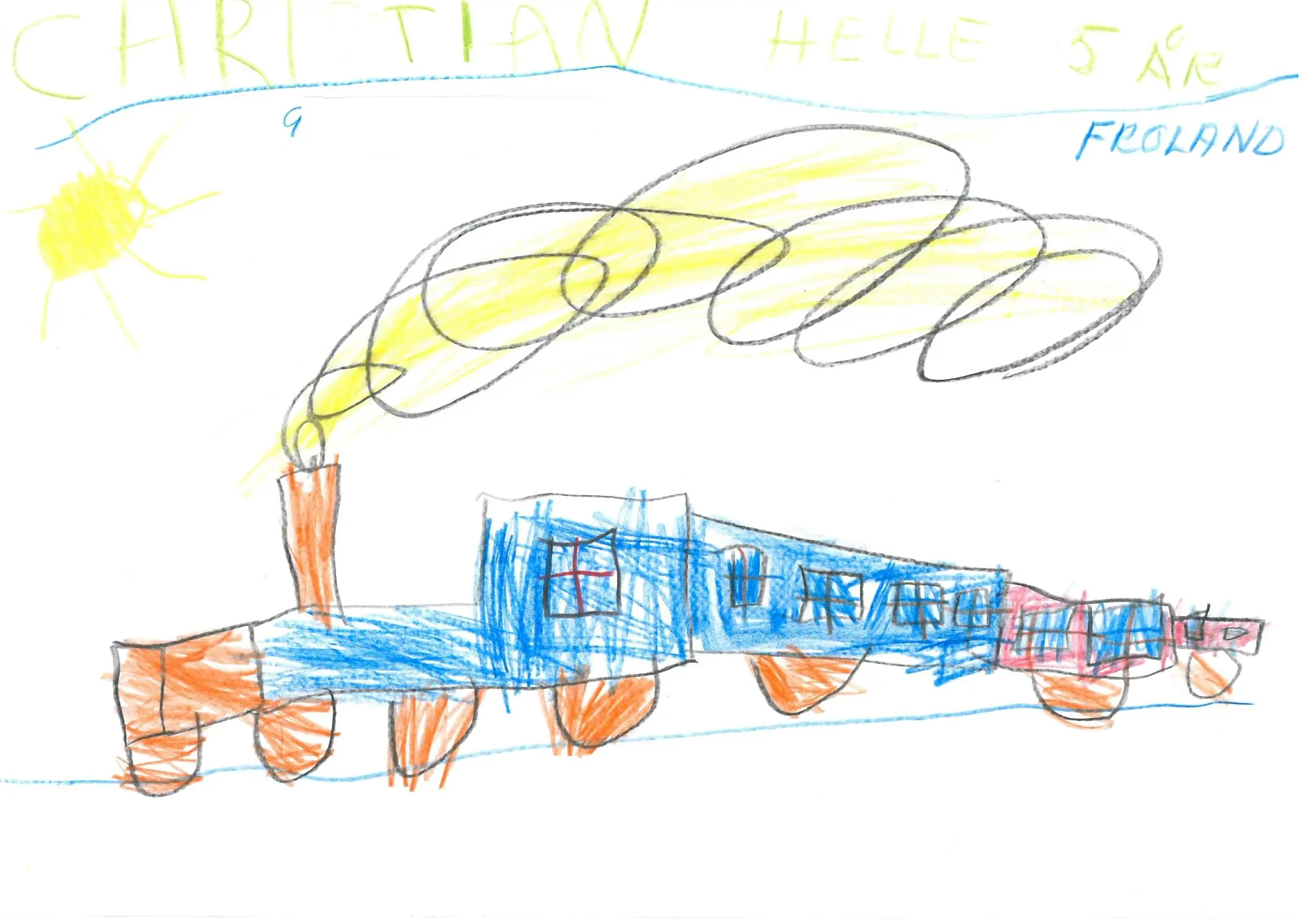 Et damptog i perspektiv, tegnet av Christian, 5 år.