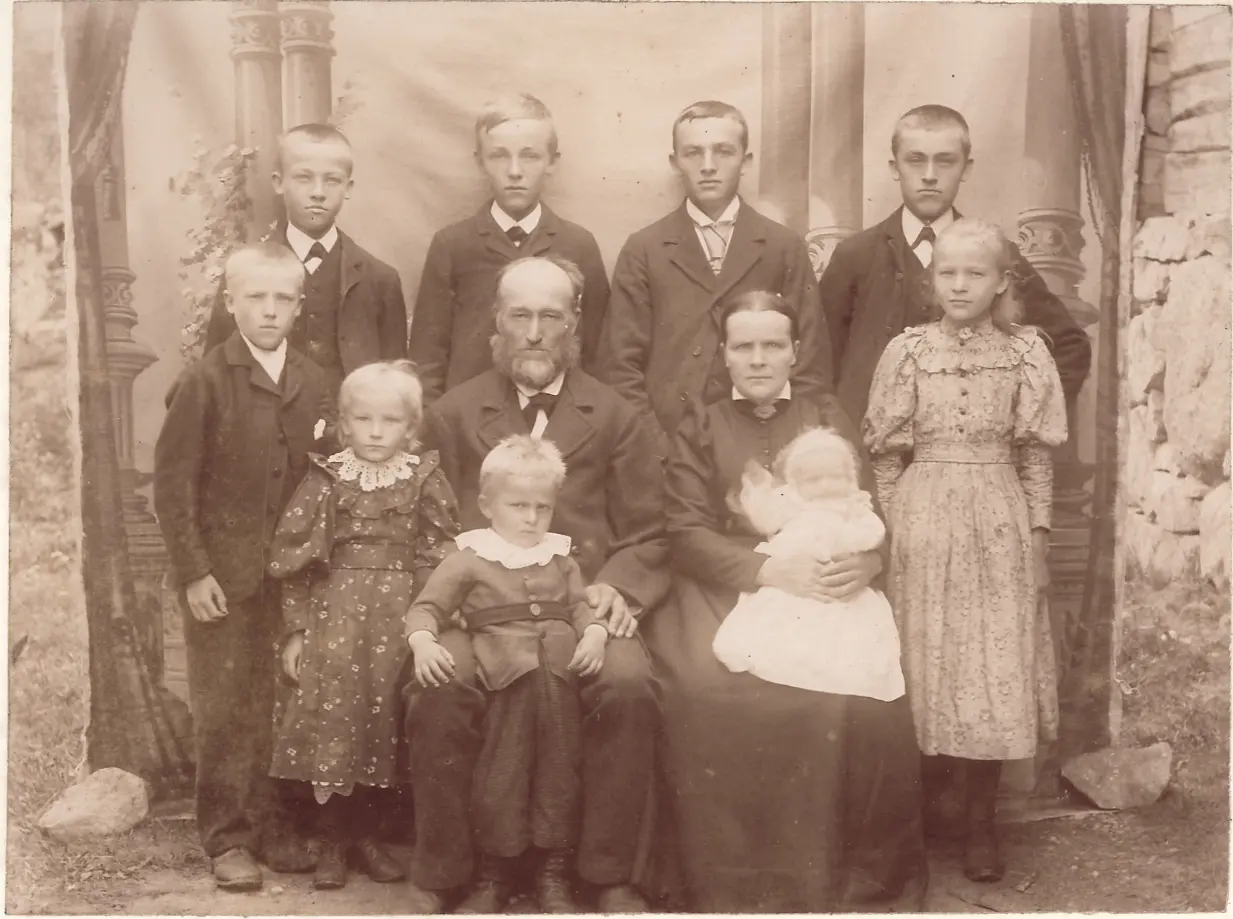 The 1900 census lists both parents and the ten children who had been born then. Søren was now 55 and listed as a farmer, Salve, 24, as a carpenter, Bernt Elias, 23, as a road construction blacksmith, Andreas, 20, as a shoemaker, and Edward, 18, as a farmhand and bricklayer’s apprentice. Maria was 45, but neither she nor the rest of the children are registered with an occupation. The youngest child, Signe, was born the year after the census.