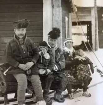 tilhører en familie som ble forflyttet under tvang til et nytt område i Sverige med reinsdyrflokken sin. For å lære å ta seg frem i det fremmede området, joiket bestefaren hennes det nye landet. Her sitter bestefaren sammen med familien, 1925. Foto: Ernst Klein, oppbevares av Nordiska museet.