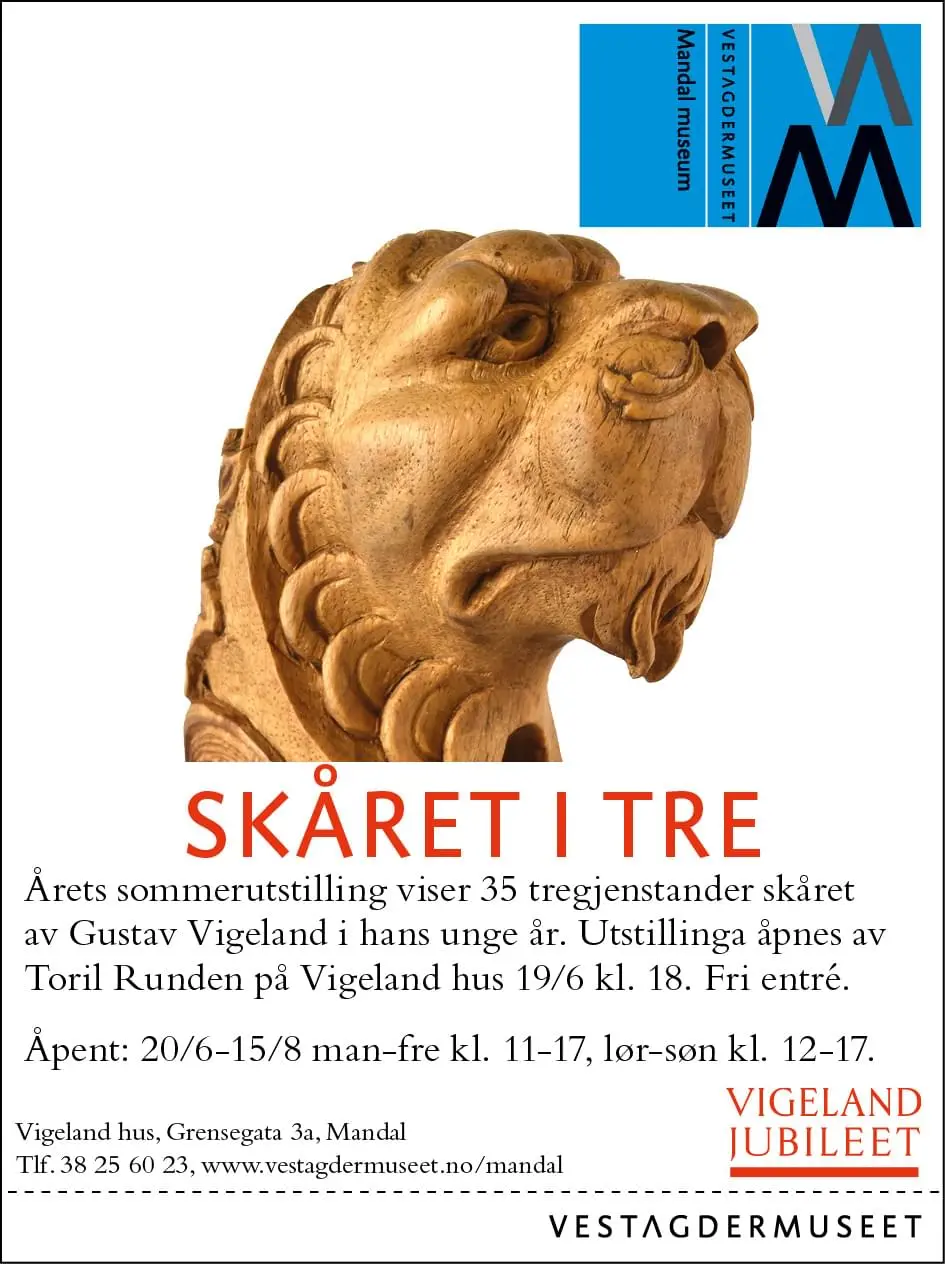 Årets sommerutstilling på Vigeland hus viser arbeider knytta til Gustav Vigelands oppvekst i vår region. Vi stiller ut tregjenstander skåret av Gustav Vigeland i hans unge år, utstilt i farens møbelsnekkerverksted, i dag en del av Vigeland hus.